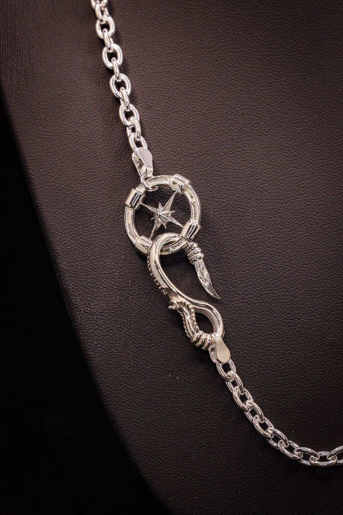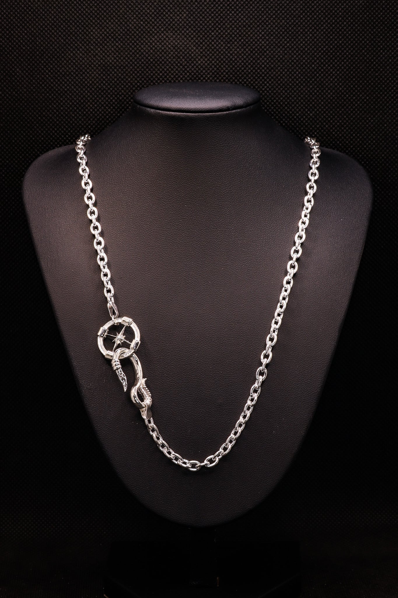通常、ネックレス着用時には留め具を首の後ろで隠すのが普通ですが、当商品はチェーンそのものをアクセサリーにしてやろうとデザインされたチェーンになります。