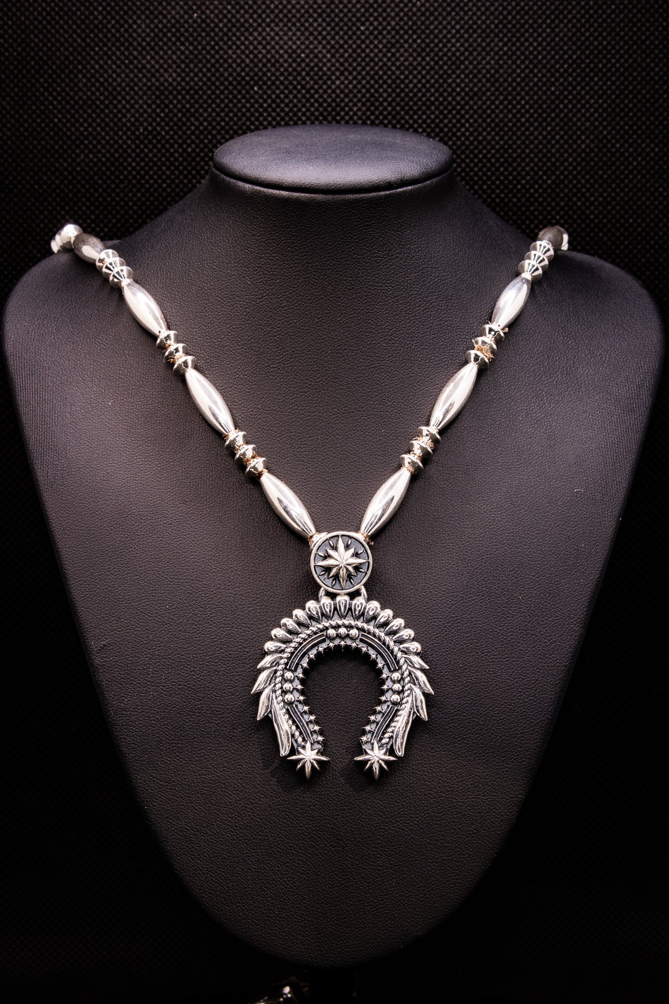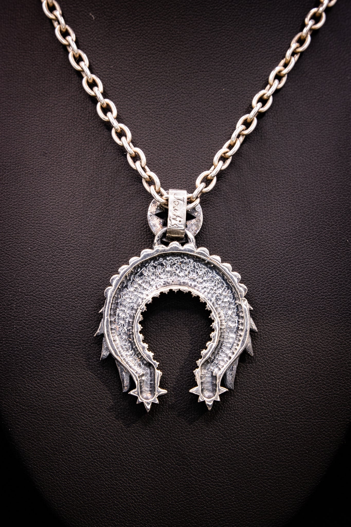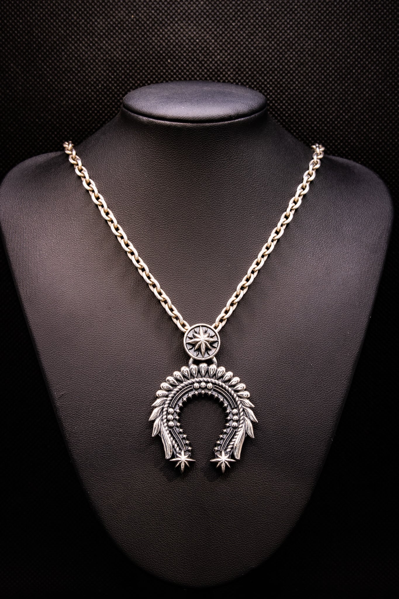 モチーフの本来の意味である〖馬蹄・三日月・子宮〗と、正面から見た際に〖ウォーボンネット〗に見えるよう細部まで拘り制作いたしました。